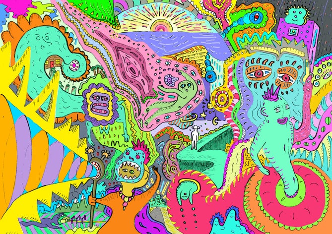 Wilde droomachtige werelden. Kleur! Fantasie! Chaos! De vrolijke illustraties van Bart Karpe (over)prikkelen je zintuigen, maar dan op de goede manier. Wentel je in de explosie van kleur en vorm – raak erin verstrikt, en laat je verrassen. Een wondere wereld, door de ogen van Bart.